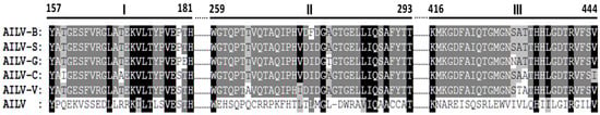 Amino acids alignment of the five 2CCP gene of the AILV isolates sequenced in this study (AILV-B, -S, -G, -C, and -V) and that reported in the GenBank (AILV: X28754), showing the positions of major variabilities (I, II, and III). Regions with high homology are highlighted in gray. Conserved amino acid residues in the six isolates are highlighted in black. Numbers correspond to the position of the amino acids in the CP gene.
