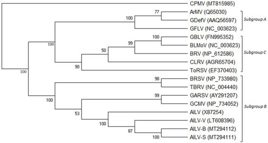 Phylogenetic tree generated from alignment of the complete RNA-2 polyprotein amino acid sequences of members belonging to subgroups A, B, and C of the genus Nepovirus. GenBank accession numbers of the sequences used are shown in brackets. The viruses used in the phylogenetic analysis are the following: grapevine chrome mosaic virus (GCMV), grapevine Anatolian ringspot virus (GARSV), artichoke Italian latent virus isolates (AILV-S, -B, -G, -C, and -V), tomato black ring virus (TBRV), beet ringspot virus (BRSV), grapevine deformation virus (GDefV), arabis mosaic virus (ArMV), grapevine fanleaf virus (GFLV), blueberry leaf mottle virus (BLMoV), grapevine Bulgarian latent virus (GBLV), blackcurrant reversion virus (BRV), tomato ringspot virus (ToRSV), and cherry leafroll virus (CLRV). Cowpea mosaic virus (CPMV) was used as an outgroup species. Bootstrap values above 50% are shown at branch points (1000 replicates).