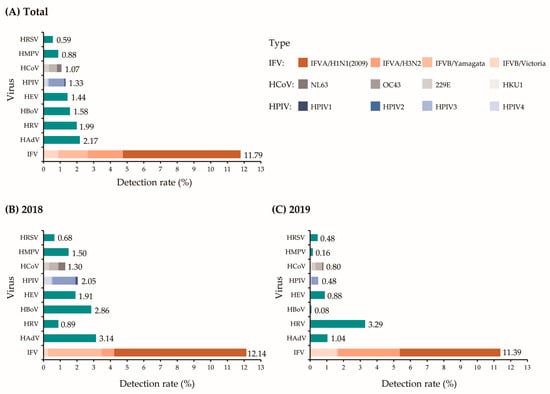 The detection rate of nine respiratory viruses between 2018 and 2019. (A) Summary data for 2018 and 2019; (B) data from 2018; (C) data from 2019.