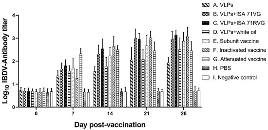 The antibody titers against IBDV were determined with ELISA at 0, 7, 14, 21, and 28 days post-vaccination (dpv). The mean serum antibody titers in each group are shown in Figure 3. From 7 to 28 dpv, all vaccinated groups had significantly higher antibody titers than the control (PBS) and negative groups (p < 0.01). The groups receiving VLPs plus adjuvant (B, C, and D) produced antibodies earlier than those given VLPs alone or inactivated vaccine, and they had higher antibody titers than the VLP-only group. The antibody titers in the VLPs with adjuvant groups continued to increase from 0 to 28 dpv, but the antibody levels in the VLP group only showed a downward trend on day 28 compared with day 21. On day 28 pv, the antibody titers in the groups receiving VLPs plus the three adjuvants were: ISA 71 RVG (log103.14) > ISA 71 VG (log102.96) > white oil (log102.51). Furthermore, the antibody titers recorded for the commercial vaccine group were as follows: inactivated vaccine (log103.10) > subunit vaccine (log102.87) > attenuated vaccine (log102.46). In addition, the antibody titers of the ISA 71 RVG group were similar to those of the inactivated vaccine group and were higher than those of the commercial subunit vaccine group and the attenuated vaccine group. The ISA 71 RVG group had higher antibody titers than the groups given commercial vaccines (subunit vaccine, inactivated vaccine, and attenuated vaccine). The results demonstrate that the E. coli-synthesized VLPs had good immunogenicity, that ISA adjuvants seem to be more efficient than white oil, and that it is as efficient as commercial vaccines, which are really good results.