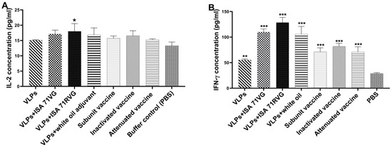 The IL-2, IL-4, and IFN-γ cytokine levels in serum samples from immunized chickens were evaluated with ELISA (Figure 4), and the statistical differences between the antigen groups and the PBS group were measured with one-way ANOVA (*** p < 0.001, ** p < 0.01, * p < 0.05). The results showed that there was no significant difference in IL-4 levels between the antigen groups and the PBS control. The IL-2 level in the VLP plus ISA 71 RVG group was significantly higher than that of the PBS group (* p < 0.05) only, but the difference was not significant with the other antigen groups (p > 0.05). For the IFN-γ levels, the antigen groups were significantly higher than the PBS group (** p < 0.01), and the VLP plus adjuvant groups were significantly higher than the commercial groups (subunit vaccine, inactivated vaccine, and attenuated vaccine) (* p < 0.05). In addition, the VLP-immunized groups exhibited the same trend in cytokine production, IFN-γ > IL-2 > IL-4, and the levels of all three cytokines in the VLP plus ISA 71 RVG group were a bit higher than in the other groups.