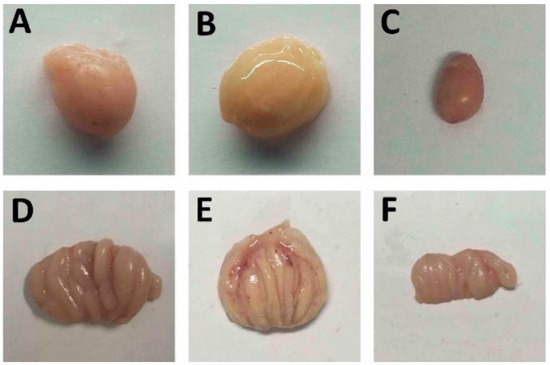 Gross morphology of bursae of chickens challenged with IBDV strain BC6/85. (A,D) Normal bursae from unvaccinated and unchallenged chickens. (B,E) Edematous, yellow jelly-like and hemorrhagic bursae from challenged chickens. (C,F) Atrophic bursae from attenuated vaccine group.