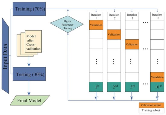 In all simulations, 100 iterations were performed to obtain the mean and standard deviation values in a uniformly random manner. In this way, the impact of noise is reduced, the appropriate values are calculated, and statistically valid results are obtained []. The phases applied in this study are described in Figure 1. As can be seen, the subjects to be studied were first chosen. Once the database was implemented, training and validation of the ML methods were carried out.