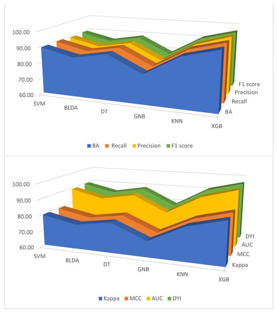 Graphical representation of balanced accuracy (BA), recall, precision, and F1 score values (top), and Kappa index, MCC, AUC, and DYI (bottom) in percentages. Abbreviations: AUC: area under curve; BLDA: Bayesian linear discriminant analysis; DT: decision tree; DYI: degenerated Younden index; GNB: Gaussian naïve Bayes; KNN: K-nearest neighbors; MCC: Matthew’s correlation coefficient; SVM: support vector machine; XGB: extreme gradient boost.