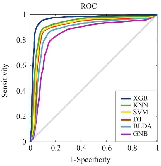 Specifically, the XGB method showcases a substantial area under the ROC curve, emblematic of its enhanced capacity to effectively classify the two distinct classes. This is further corroborated by the numerical values provided in Table 1.