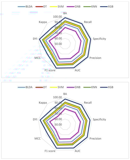 KNN and SVM shine as the algorithms that closely match XGB in terms of precision and recall values, outperforming DT and, notably, surpassing GNB and BLDA in terms of results. Moreover, this pattern is reflected in Table 1 when considering the F1 score parameter, where XGB attains elevated values, serving as a clear indicator of enhanced classification performance.