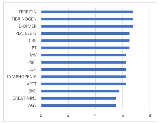 With the proposed XGB method, the predictor factors or variables associated with a worse outcome in critically ill COVID-19 patients in terms of mortality were: age; high BMI; elevated ferritin, LDH, CRP, and creatinine levels; lymphopenia; low PaFi values; use of IMV; and abnormal values in hemostasis and coagulation, namely elevated PT and aPTT, elevated D-dimer and fibrinogen, and low platelet levels. Figure 5 displays a bar chart illustrating the weights of predictor variables that significantly enhance classification accuracy across various ML methods.