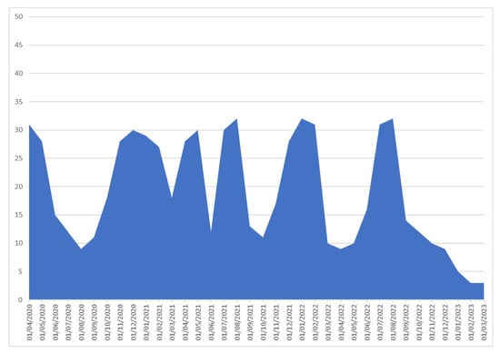Figure 6 provides a graphical representation of the number of selected patients admitted to the hospital with severe COVID-19 throughout the six pandemic waves and until the end of the study.