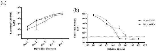 We produced and assayed infectious clones of ZIKV expressing nLuc [9] and teLuc genes, the latter a version of nLuc with improved spectral properties [11], cloned as described in the Section 2 (Figure 1). Both nLuc- and teLuc-ZIKV were produced in Vero cells, concentrated, and then tested for infectivity. First, three dilutions of nLuc-ZIKV were used to infect Vero cells; viral growth kinetics were assessed by measuring the secreted and intracellular bioluminescence signal (Figure 2a, only the signal measured intracellularly is shown) for up to five days post-infection. As expected, at all dilutions and time points, the intracellular signal was higher than that secreted, given that the reporter enzyme is processed and released intracellularly. A similar pattern has been seen for other virally encoded proteins for various clinical and laboratory ZIKV isolates [15].