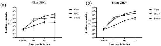 Next, we compared the infectivity kinetics of nLuc- and teLuc-ZIKV in Vero, BeWo, and Jeg-3 cells when inoculated at similar dilution (Figure 3). We found that the virus propagates in all these cell lines, with the highest luciferase activity produced in Vero, then Jeg-3 cells (Figure 3a). It can be noted that a similar trend can be seen with teLuc-ZIKV (Figure 3b).
