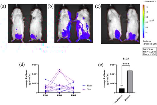 Finally, we used the nLuc-ZIKV reporter virus to assess infection kinetics and proliferation in live animals using bioluminescent imaging (BLI). Either viral preparation (107 FFU/animal) or diluent buffer saline (sham) was administered subcutaneously to n = 6 and n = 4 juvenile Hartley guinea pigs, respectively. Nanoluciferase activity was assessed by whole-body bioluminescence on post-infection day (PID) 1, 3, and 5, following IP administration of substrate. We found that all animals inoculated with sham preparation had a low luminescence signal at all time points, as evidenced by the small area with pixels of low radiance (Figure 5a, colored dark blue, representative images are shown). This area coincides with the site of IP administration of the substrate, and it is likely due to the autoluminescence of the substrate. On the other hand, on PID3, 2 out of 6 animals inoculated with viral preparation had both larger areas with dark blue pixels, extending beyond the site of administration, and pixels with higher radiance as demonstrated by regions colored in brighter shades (Figure 5b). However, the other 4 out of 6 guinea pigs inoculated with the viral preparation looked similar to the sham-inoculated animals, a representative image is shown (Figure 5c). To quantify the signal, an ROI that encompassed the entire body of the animal was defined (Figure 5a–c, red contour around each guinea pig) and the total flux expressed as photons per second (p/s) and the average radiance (p/s/cm2/sr) was calculated for every experimental day. Both parameters have a similar time dependence, confirming the qualitative results in Figure 5a–c (Figure 5d, shown is the average radiance only). Although there was no statistical difference in the flux or radiance of infected versus sham animals, a comparison of the subset of the animals that exhibited increased signal (n = 2) with sham animals on PID 3 indicates statistical significance (t-test, p = 0.0001). There were no statistically significant differences between PID 1 and 5. The timing of peak viremia on PID 3 is in general agreement with the time of peak viremia measured using qRT-PCR in the serum of animals inoculated with ZIKV PRVABC59 [16].
