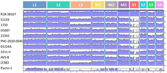 3.3. Whole Genome Organization of the R18-37308 and R18-38167 Strains Show Conserved Terminal UTRs and the Lack of a Common Ancestor