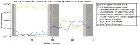 Finally, our recombination analysis failed to provide strong evidence of any incidence of recombination as six out of seven algorithms did not detect any recombination breakpoints, which assures the lack of any parental strains. A wild bird ARV was found to be recombined with GX110116 (a Chinese vaccine strain) in South Korea at breakpoints ~300 and 500 and with K1600657 (Californian, of chicken origin) at around 700–900 nucleotide sequence positions [101], which disagrees with our lack of recombination events; this is most probably due to spatial and temporal variations as well as differences in the host (wild birds).