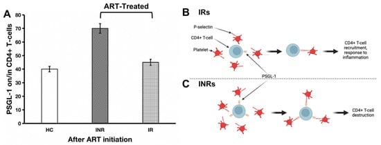PSGL-1 expression after ART initiation (A) and its implications for CD4+ T-cell destruction in HIV-positive individuals receiving ART. In IRs (B), the lower rate of inflammation is manifested by low levels of PSGL-1 expression (which are comparable to levels of inflammation in healthy controls). In this context, PSGL-1 will help with recruiting CD4+ T-cells to the site of inflammation. In contrast, in INRs (C), despite ART administration, the level of inflammation remains significantly elevated. In this scenario, excess PSGL-1 will lead to engagement with platelets. Ultimately, these PSGL-1/platelet aggregates entrap CD4+ T-cells and lead to their destruction. This hypothesis will require exploration and validation by future studies. HC: healthy control; INR: immunological nonresponder; IR: immunological responder.