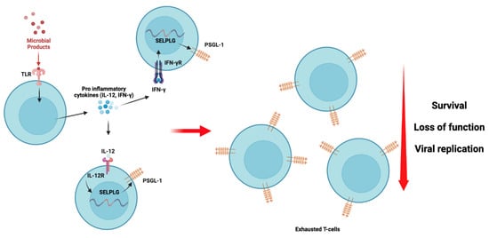 It has been established in ART-treated HIV-infected individuals that translocated microbial products continuously circulate in the bloodstream and provoke and sustain chronic inflammation []. During HIV infection, T-cell exhaustion can be seen as a consequence of chronic and sustained antigenic stimulation []. However, in patients with undetectable HIV viral loads, we believe that translocated microbial products may also induce a sustained expression of PSGL-1 (Figure 4), which may promote T-cell exhaustion. Thus far, we have found no published data in the literature presenting or discussing this hypothesis. However, it is known that interferon gamma (IFN-γ) [], sCD40 ligand (sCD40L) [], interleukin (IL)-12 [], and glutamate [] may trigger PSGL-1 expression on immune cells. In a recent publication by Hope et al. [], it was observed that PSGL-1 blockade may reinvigorate exhausted T-cells. Thus, PSGL-1 represents a potential new target to suppress T-cell exhaustion in HIV-infected patients, particularly in those non-responsive to CTL-4 and/or PD-1 immune checkpoint blockade. Further investigations are warranted in this regard, particularly in the context of HIV infection, to validate this hypothesis.