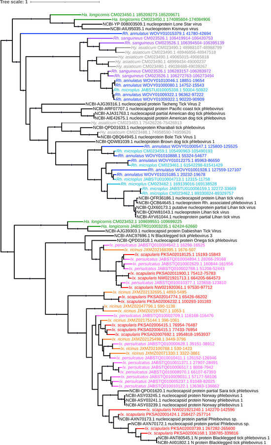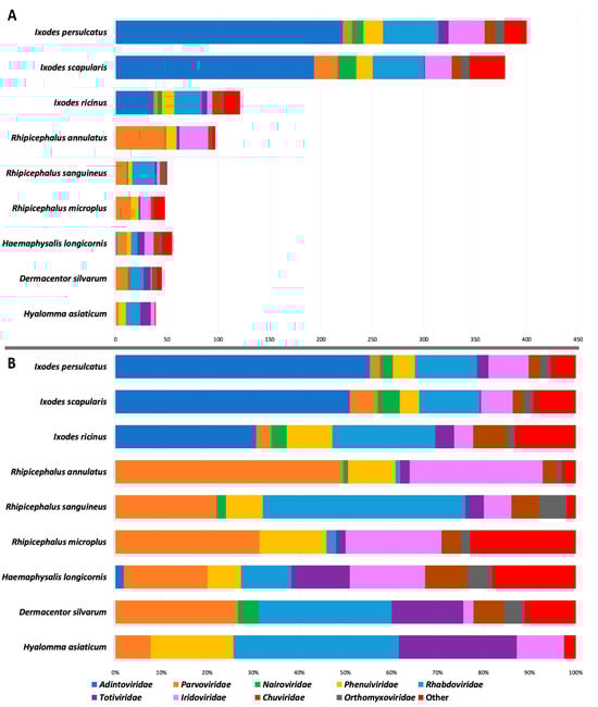 - Qin, T.; Shi, M.; Zhang, M.; Liu, Z.; Feng, H.; Sun, Y. Diversity of RNA viruses of three dominant tick species in North China. Front. Vet. Sci. 2022, 9, 1057977. [Google Scholar] [CrossRef] [PubMed]