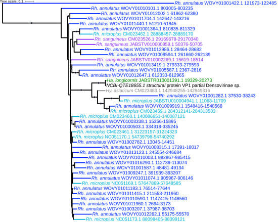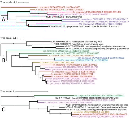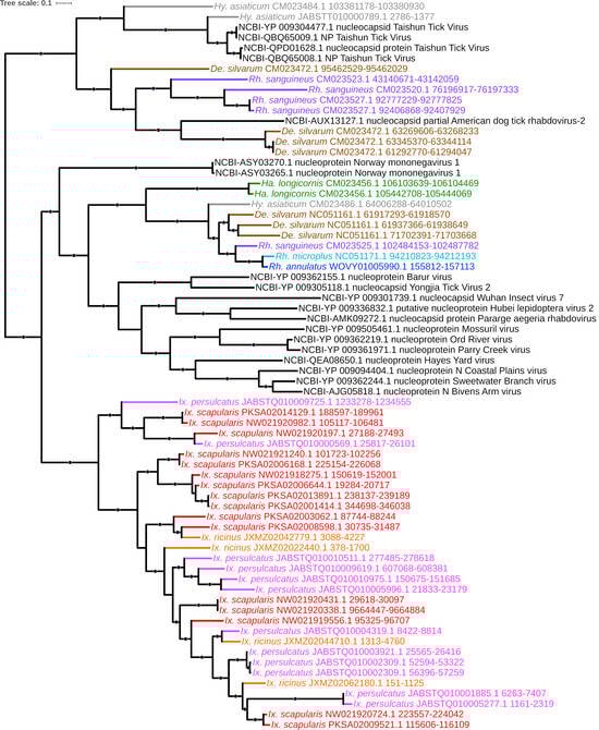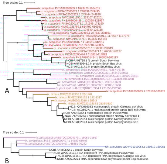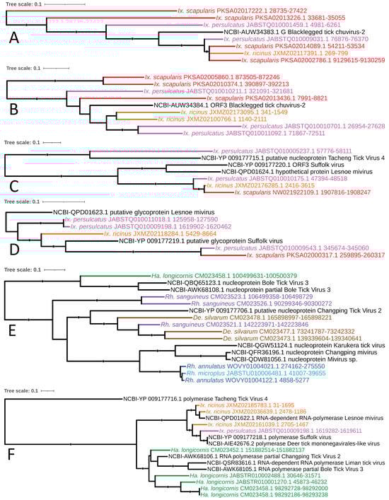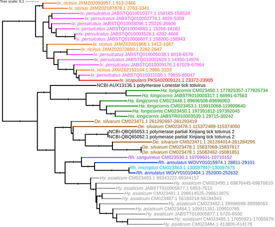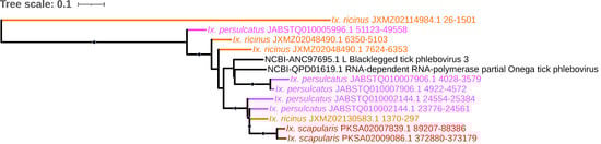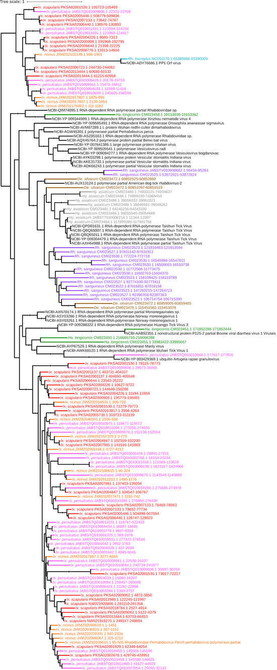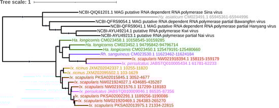 - Russo, A.G.; Kelly, A.G.; Enosi Tuipulotu, D.; Tanaka, M.M.; White, P.A. Novel insights into endogenous RNA viral elements in Ixodes scapularis and other arbovirus vector genomes. Virus Evol. 2019, 5, vez010. [Google Scholar] [CrossRef] [PubMed]
