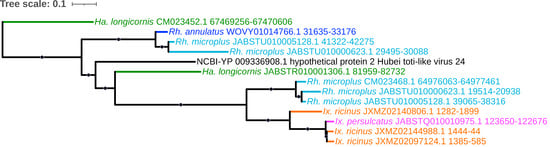 - Charrier, N.P.; Hermouet, A.; Hervet, C.; Agoulon, A.; Barker, S.C.; Heylen, D.; Toty, C.; McCoy, K.D.; Plantard, O.; Rispe, C. A transcriptome-based phylogenetic study of hard ticks (Ixodidae). Sci. Rep. 2019, 9, 12923. [Google Scholar] [CrossRef]