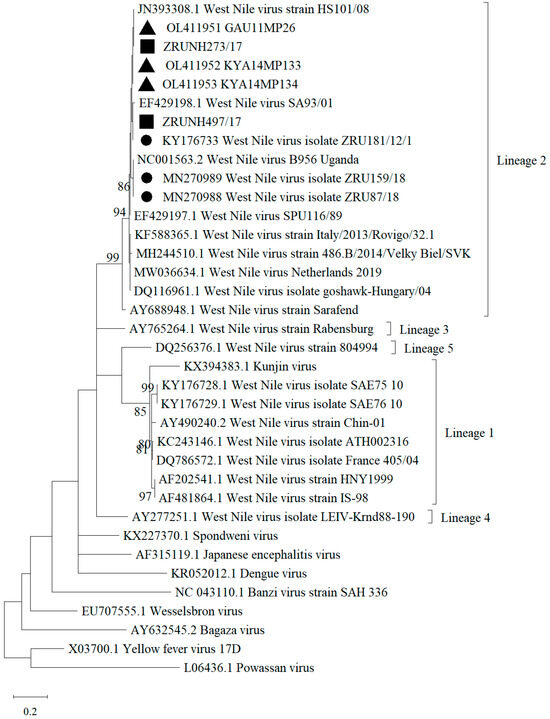 Maximum Likelihood phylogram of the partial NS5 gene (nt = 226) used for confirmation of WNV human infection indicating bootstrap (bs) support values on the branches (36 taxa). Viral sequences obtained in this study from hospitalized patients in SA are indicated by filled squares. Filled black triangles indicate sequences identified in mosquito vectors [15]. Filled circles represent the viral sequences identified in animals in South Africa [18]. Values are shown if bs support was ≥70. The evolutionary history was inferred using the Kimura 2-parameter model plus gamma distribution. The tree is drawn to scale and branch lengths represent the number of nucleotide substitutions per site. Reference sequences were downloaded from GenBank. GenBank accession numbers for the WNV NS5 sequences are ZRUNH273/17 = OL790166, ZRUNH497/17 = OL790167.