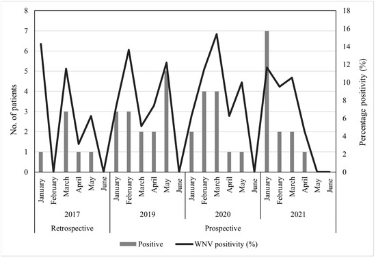 The seasonality of WNV in hospitalized patients in South Africa, January–June 2017, 2019 to 2021.