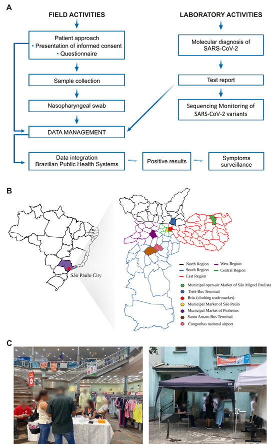 (A) Flowchart illustrating the primary field and laboratory procedures involved in assessing the prevalence of asymptomatic SARS-CoV-2 infection in São Paulo city. (B) Map of São Paulo, presenting the locations of the sampling points. The map features distinct color-coded lines representing the major city regions, grouped together based on neighborhood proximity. The shaded neighborhoods on the map indicate the precise sampling points chosen for data collection and analysis. (C) Image showcasing the collection points for the samples.