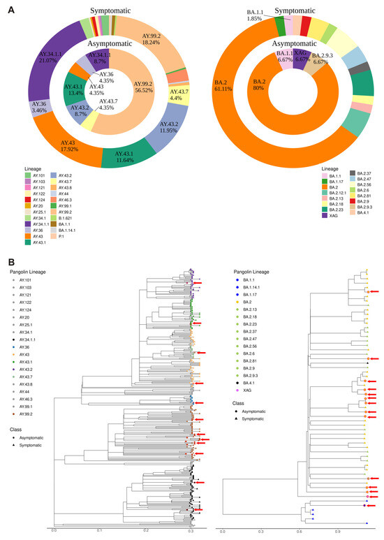 Lineage distribution across samplings. Outer circles: genomes obtained from symptomatic individuals (used as background); inner circles: genomes obtained from asymptomatic individuals (from this study). (A—left) Lineage distribution from the Delta wave, containing 23 genomes from asymptomatic individuals and 318 genomes from symptomatic individuals. (A—right) Lineage distribution from the Omicron wave, containing 15 genomes from asymptomatic individuals and 54 genomes from symptomatic individuals. (B) Maximum likelihood tree of genomic sequences from São Paulo city. (B—left) Samples from Delta wave. (B—right) Samples from Omicron wave. Genomes from symptomatic individuals are represented by triangles in the tip of the trees, while asymptomatic genomes are represented by circles, pointed by red arrows.