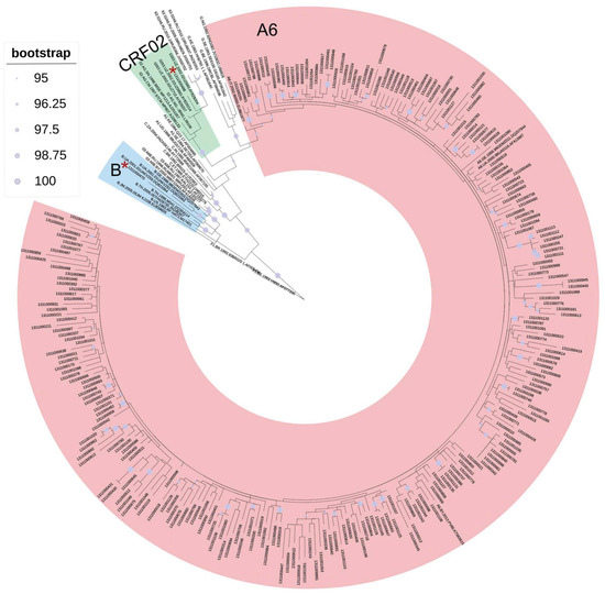 Originally, subtyping of HIV-1 was performed on tat exon 1 by two methods: (1) COMET HIV-1 (http://comet.retrovirology.lu/, accessed on 15 September 2023), which uses context-based modeling for rapid typing of HIV-1 viruses; (2) Recombinant Identification Program version 3 (RIP 3.0) with a window size of 50 nucleotides, which detects recombination in shorter sequences (<700 nt) (https://www.hiv.lanl.gov/content/sequence/RIP/RIPexplain.html, accessed on 15 September 2023). Phylogenetic analysis was performed to clarify the results of primary subtyping.