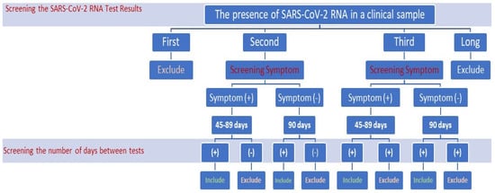 Considering the CDC reinfection criteria, the inclusion and exclusion criteria for this study are presented in Figure 1. In this study, we identified patients with positive SARS-CoV-2 qPCR test results, along with the time between the first positive test and the second positive test based on the criteria established by the CDC. Included in this study as “reinfection cases” were individuals who exhibited symptoms similar to COVID-19 and who tested positive via PCR at 45–89 days since their initial SARS-CoV-2 infection, and those who tested positive for PCR after 90 days since their first SARS-CoV-2 infection but did not exhibit COVID-19-like symptoms. Latent cases that remained positive for a long time were not included in the study.