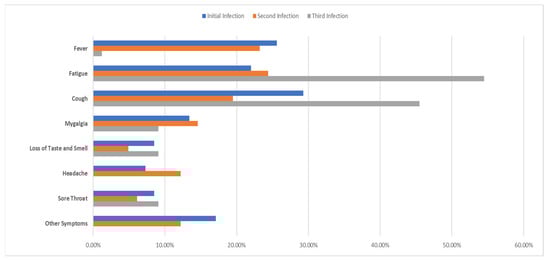 Coughing was the most prevalent symptom in the initial infection, while fatigue was the most common symptom in the second and third reinfections (Figure 2).
