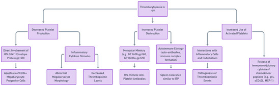 The pathogenesis of HIV-associated thrombocytopenia is multifactorial, involving both direct and indirect mechanisms and potentially leading to thrombotic complications. Direct mechanisms include the infection of megakaryocytes, the progenitor cells of platelets, by the virus, leading to impaired platelet production [10]. Indirect mechanisms involve immune-mediated ways of platelet destruction, including the production of anti-platelet antibodies, immune complex deposition on platelets, and the effects of opportunistic infections and certain drugs [11]. The potential impairment of platelet generation has been suggested as one of the underlying factors in HIV-related thrombocytopenia, a theory supported by observations of platelet dynamics, outcomes from tests examining megakaryocyte colony formation, and electron microscopy revealing the direct viral infection of megakaryocytes [12]. Figure 1 summarizes the pathways of HIV-associated thrombocytopenia.