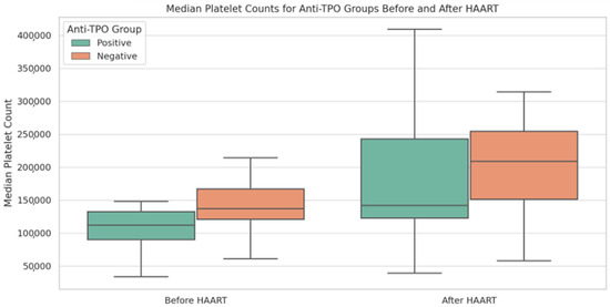Median platelet counts for anti-TPO groups before and after HAART initiation. The box plots above visualize the distribution (median and IQR) of platelet counts for each anti-TPO group across two time points.