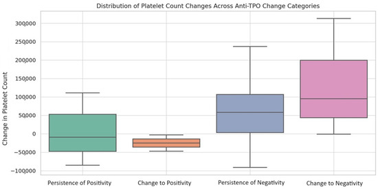 Distribution of platelet-count changes across anti-TPO change categories. The box plots above visualize the distribution of platelet count changes across each anti-TPO change category. The plots include whiskers that extend to 1.5 times the interquartile range, providing a more detailed view of the data distribution.