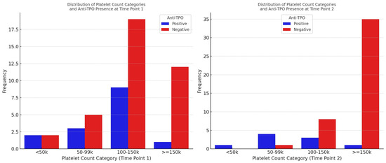 Across all the categories of thrombocytopenia severity, no statistically significant changes in the proportions of anti-TPO (+) cases were observed between the two time points (Table 6). When considering thrombocytopenia as a binary variable (platelet count < 150,000), the test for paired proportions revealed no statistically significant change in the proportion of anti-TPO (+) and anti-TPO (−) from time point 1 to time point 2 (p = 0.392).