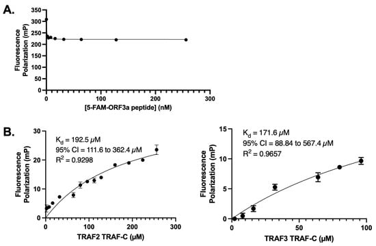 To quantify the strength of the ORF3a-TRAF interaction, we performed fluorescence polarization (FP) experiments with fluorescently labeled PIQAS peptide (Figure 2). To enhance TRAF protein stability at high concentrations in the assay, SUMO fusion proteins of the TRAF-C domains from TRAF2 or TRAF3 were used. The concentration of the TRAF proteins used in the assays ranged from 0–256 μM for TRAF2 and 0–96 μM for TRAF3. A constant peptide concentration (30 nM peptide for TRAF2 experiments and 50 nM peptide for TRAF3 experiments) was selected based on FP curves generated using ORF3a peptide alone with the aim of minimizing background noise while maintaining significant FP signals (Figure 2A). The binding affinities between the PIQAS peptide and SUMO-TRAF-C proteins were in the range of 150–200 μM (192.5 μM for TRAF2 and 171.6 μM for TRAF3) (Figure 2B). This is consistent with previously reported affinity measurements of ~200 μM for TRAF proteins binding to peptides from various membrane receptors [].