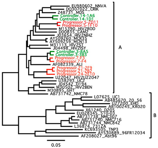 Maximum-likelihood phylogenetic tree of near full genome sequences of replication-competent HIV-2 isolated from donors and HIV-2 group reference sequences. HIV-2 sequences are shown in green when they were derived from controllers’ viruses and red from progressors. Sequences are labelled with “controller” or “progressor” followed by a patient ID number (“3”, “5”, “7”, “21” and “24”) and code identifying individual virus isolates (e.g., “1A6”). Genomes with identical patient ID number were derived from a single donor. Also included are HIV-2 group A and B reference sequences. Horizontal branch lengths are proportional to the scale bar at the bottom indicating nucleotide substitutions per site.