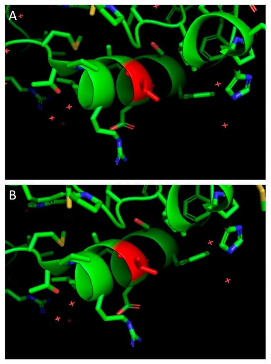 In silico structure modelling of HIV-2 Nef illustrating the residues I117 (A) and V117 (B). The overall structure of the protein remained unchanged. The residues of interest are shown in red.