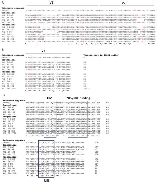 Conservation of functionally important residues and regions in Env and Rev of HIV-2 from controllers and progressors. (A) Amino acid sequence alignment of Env V1 and V2 hypervariable regions from controllers and progressors. Red letters indicate potential N-glycosylation sites based on the N-X-S/T motif, where X is any amino acid but P. (B) Amino acid sequence alignment of the Env V3 hypervariable region from controllers and progressors. The tropism indicated was previously published [36]. (C) Amino acid sequence alignment of Rev from controllers and progressors. The homo-multimerization region (HM), nuclear localization signal/Rev-response element-binding motif (NLS/RRE binding), and nuclear export signal (NES) are indicated. The HIV-2 ROD sequence (GenBank Accession ID:M15390) was used as a reference. (*) indicate amino acid conservation, (:) indicates conservative polymorphisms, (.) indicates semi-conservative polymorphisms, and (-) indicates a gap.