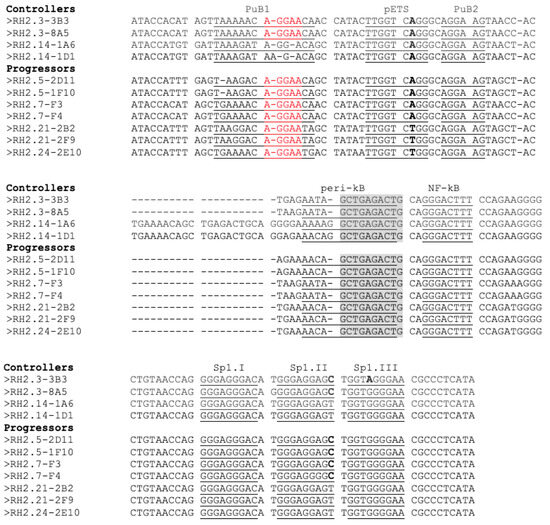 Alignment of the regulatory region of the HIV-2 LTR from controllers and progressors. Binding sites are indicated above the sequences. The AGGAA motif in PuB1 is marked in red. Sequence variations in the pETS and Sp1 motifs are shown in bold. The conserved 3′-half of the peri-kB site is highlighted in grey.