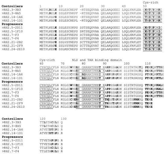 Alignment of HIV-2 Tat protein sequences from controllers and progressors. Cysteine-rich and the nuclear localization signal (NLS) and TAR-binding domains are underlined. Naturally polymorphic residues are in bold.