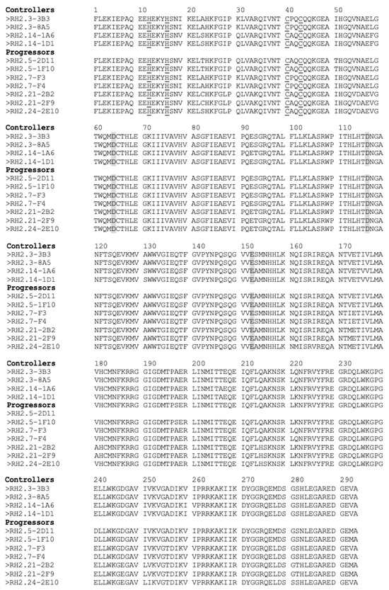 Alignment of HIV-2 integrase protein sequences from controllers and progressors. The zinc-binding domain is underlined. The D-D-E catalytic triad is shaded.