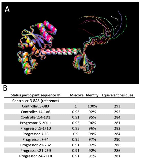 Comparison of integrase structures. (A) Pairwise alignment of all integrase in silico structures generated from the controllers and progressors of this study. Only the unstructured C-termini showed significant structural deviation (right side). (B) Pairwise scoring of integrase structure alignments. Sequence 8A5 from controller RH2.3 was used as a reference. TM-score, identity, and equivalent residues were quantified.
