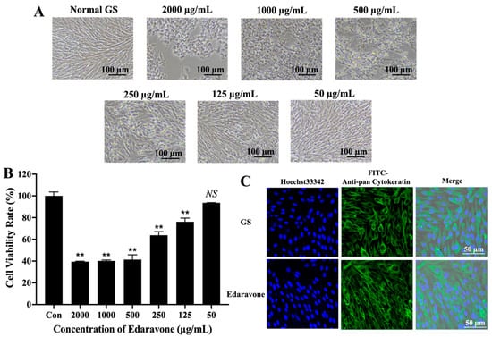 Safe cell concentration of edaravone. (A) It was observed by microscopy that the cell morphology changed significantly at the concentrations higher than 50 µg/mL. Scale: 100 μm. (B) Cell activity analysis also revealed that the concentration of 50 µg/mL had no effect on the cell activity. Data are shown as the mean SD (n = 3), ** indicating p ≤ 0.01, Ns indicating p > 0.05. (C) The cytoskeleton of the cells incubated with edaravone (50 μg/mL) remained normal compared with the control cells. Scale: 50 μm.