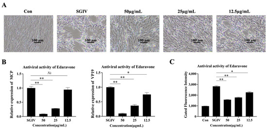 To explore the effect of edaravone on SGIV infection, we treated SGIV-infected cells with edaravone. GS cells cultured with SGIV + edaravone (50, 25, 12.5 µg/mL) were the test group, and cells infected with SGIV alone were the control group. Cell morphology was observed using light microscopy. Few typical cytopathic effects (CPEs) were observed in cells cultured with SGIV + edaravone (50, 25 µg/mL) (Figure 2A). In addition, the expression of the SGIV MCP and VP19 gene was significantly lower in the edaravone treated group (50 µg/mL, 25 µg/mL) compared to the control (Figure 2B). Similarly, flow cytometry assays showed a significant decrease in fluorescence intensity in cells treated with edaravone (Figure 2C).