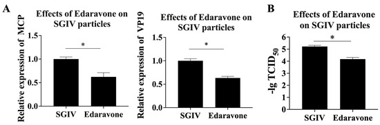 Edaravone has a destructive effect on SGIV particles. (A) The expression of SGIV MCP gene was significantly decreased, 1.6-fold, and the SGIV VP19 gene was significantly decreased, 1.57-fold, in the edaravone (50 µg/mL) treated group compared to the control. (B) The SGIV -lgTCID50 in the test group was significantly decreased, 1.25-fold. Data are shown as the mean SD (n = 3), with * indicating p ≤ 0.05.