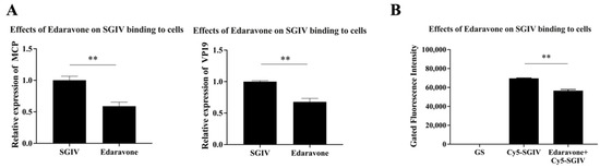Inhibitory effect of edaravone on the binding of SGIV to host cells. (A) The expression of the SGIV MCP gene was significantly decreased, 1.7-fold, and the SGIV VP19 gene was significantly decreased, 1.48-fold in the edaravone (50 µg/mL) treated group compared to the control. (B) Flow cytometry results showed that the Cy5 fluorescence signal was significantly decreased, 1.14-fold, in cells treated with edaravone (50 µg/mL) compared with the control group. Data are shown as the mean SD (n = 3), with ** indicating p ≤ 0.01.