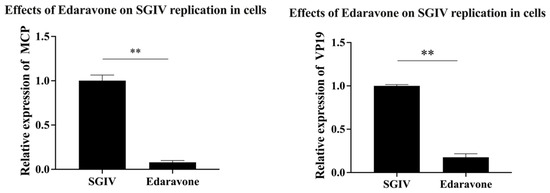 The effect of edaravone on SGIV replication in host cells was analyzed by RT-qPCR. The results showed that the expression of SGIV MCP and VP19 genes was significantly decreased in the cells treated with edaravone (50 µg/mL) compared to the control group (Figure 5), suggesting that edaravone could inhibit the replication of SGIV in the cells.