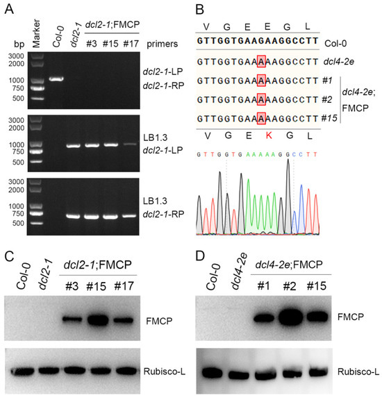 For homozygous dcl2-1 genotyping, the T-DNA primers LB1.3, dcl2-1-LP and dcl2-1-RP, were designed on the website T-DNA Primer Design (http://signal-genet.salk.edu/tdnaprimers.2.html, accessed on 7 October 2022). Then, a PCR with these primers amplified genomic DNA from homozygous dcl2-1 and wild-type Arabidopsis plants. Genotyping for homozygous dcl4-2e was performed as described previously [38], and PCR products were then sequenced using the sanger method.