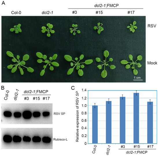 Evaluation of rice strip virus (RSV) resistance of RSV CP transgenic Arabidopsis plants with the dcl2 mutant background. (A) Disease symptoms of mock-inoculated and RSV-infected CP transgenic plants with the dcl2-1 mutant background (dcl2-1;FMCP-3, dcl2-1;FMCP-15, dcl2-1;FMCP-17) and dcl2-1 and Col-0 Arabidopsis plants. Photographs were taken at 4 weeks post-inoculation. (B) Western blot analysis of RSV-encoded SP protein accumulation in RSV-infected CP transgenic plants with the dcl2-1 mutant background (dcl2-1;FMCP-3, dcl2-1;FMCP-15, dcl2-1;FMCP-17) and dcl2-1 and Col-0 Arabidopsis plants using an SP-specific antibody. The Rubisco-L protein level served as a loading control. Arabidopsis plants were all collected at 28 dpi. (C) qRT-PCR analysis of RSV SP mRNA transcription levels in RSV-infected CP transgenic plants with the dcl2-1 mutant background (dcl2-1;FMCP-3, dcl2-1;FMCP-15, dcl2-1;FMCP-17) and dcl2-1 and Col-0 Arabidopsis plants. Signal intensities for each transcript were normalized to those for EF1-α. Values are means ± SD (n = 3). The experiment was repeated twice with similar results.