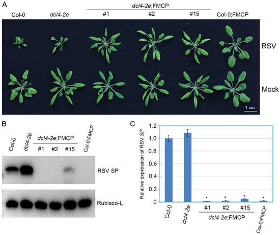 Examination of rice strip virus (RSV) resistance of RSV CP transgenic Arabidopsis plants with the dcl4 mutant background. (A) Disease symptoms of mock-inoculated and RSV-infected CP transgenic plants with the dcl4-2e mutant background (dcl4-2e;FMCP-1, dcl4-2e;FMCP-2, dcl4-2e;FMCP-15) or wild-type background (Col;FMCP) and non-transgenic dcl4-2e and Col-0 Arabidopsis plants. Photographs were taken at 4 weeks post-inoculation. (B) Western blot analysis of RSV-encoded SP protein accumulation in RSV-infected CP transgenic plants with the dcl4-2e mutant background (dcl4-2e;FMCP-1, dcl4-2e;FMCP-2, dcl4-2e;FMCP-15) or wild-type background (Col;FMCP) and non-transgenic dcl4-2e and Col-0 Arabidopsis plants using a SP-specific antibody. The Rubisco-L protein level served as a loading control. Arabidopsis plants were all collected at 28 dpi. (C) qRT-PCR analysis for RSV SP mRNA transcription levels in RSV-infected CP transgenic plants with the dcl4-2e mutant background (dcl4-2e;FMCP-1, dcl4-2e;FMCP-2, dcl4-2e;FMCP-15) or wild-type background (Col;FMCP) and non-transgenic dcl4-2e and Col-0 Arabidopsis plants. Signal intensities for each transcript were normalized to those for EF1-α. Values are means ± SDs (n = 3). * p ≤ 0.05 (Student’s t-test). The experiment was repeated twice with similar results.