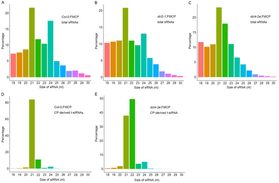 We previously showed that RSV CP-mediated virus resistance was associated with transgene-derived 21–24 nt small RNAs on CP loci (t-siRNAs) [35]. To further explore the function of DCL2 and DLC4 in regulating CP-derived t-siRNAs, we conducted small RNA deep sequencing with total RNA prepared from dcl2-1;FMCP and dcl4-2e;FMCP transgenic plants using Col-0;FMCP as a control. Each sample generated 11–14 million clean reads ranging from 18 to 30 nt (Table 1). Within the dcl2-1;FMCP and Col-0;FMCP samples, the size distributions of total small RNAs were similar; the dominant size was 21 nt, which was followed by 24 nt and 22 nt (Figure 4A,B). However, in dcl4-2e;FMCP, the most dominant sizes of total small RNAs were 21 nt, followed by 22 nt, and the number of 24 nt small RNAs was reduced, while the number of 22 nt small RNAs was increased compared to those in dcl2-1;FMCP and Col-0;FMCP plants (Figure 4C). These results indicate that when DCL4 function was impaired, endogenous 22 nt small RNAs were excessively produced by DCL2.